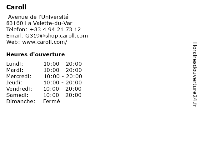2 Caroll (Distance: 0,46 km) Avenue André Lurçat, 83160 La Valette blazer femme, cardignan femme, caroll, chaussures femme, gilet femme, jean femme, magasin femme, magasin vêtements, manteau femme, mode femme, pull femme, robe femme, sac femme, t-shirt femme, tailleur femme, top femme, vêtements femmes 3 Caroll (Distance: 7,19 km) 9 Boulevard de Strasbourg, 83000 Toulon accessoires, caroll, divers, habillement, international, magasins 6 Caroll (Distance: 9,43 km) 4 Avenue Général de Gaulle,, 83400 Hyères caroll, femme, jeans, mode, pantalons, tendances, vetements |