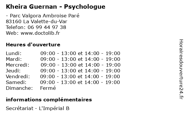 | Lundi | 09:00-13:00 et 14:00-19:00 |