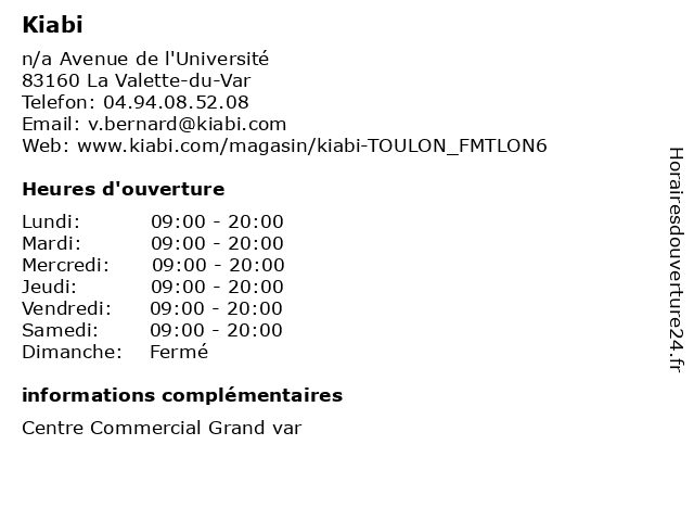 1 Kiabi (Distance: 8,51 km) n/a Zone d'activités de la Poulasse, 83210 Sollies-Pont accessoires, chaussure, kiabi, mode, vêtements 2 Kiabi (Distance: 10,12 km) n/a Lieu dit Lagoubran, 83190 Ollioules accessoires, chaussures, discount, habillement, kiabi, mode, petits prix, pret-a-porter, vetements 3 C&A (Distance: 0,08 km) 115 Avenue de l´Université, 83160 La Valette-du-Var accessoires, c&a, habillement, mode, pret à porter, vetements 4 Le Temps des Cerises (Distance: 0,20 km) n/a route de l'Université, 83160 La Valette du Var accessoires, cerises, des, habillement, le, mode, pret à porter, temps, vêtements 5 Zapa (Distance: 0,20 km) - avenue de l'Université, 83160 La Valette du Var accessoires, chaussures, habillement, mode, porter, pret, sacs, vêtements, zapa 6 Muy Mucho (Distance: 0,23 km) 83 Avenue Jacqueline Auriol, 83160 La Valette-du-Var ameublement, bazar, discount, déco, décoration, linge, maison, meubles, mobilier, mucho, muy, petits, prix, vaisselle |