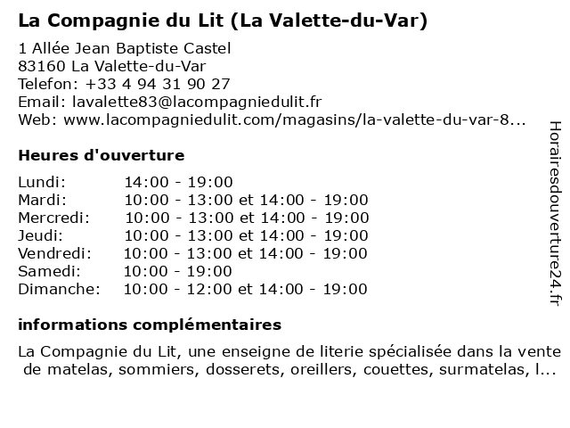Termes de recherche pour La Compagnie du Lit (La Valette-du-Var):la, du, lit, var, literie, compagnie, matelas, linge de lit, oreiller, sommier, valette, couette, draps, surmatelas, dosseret, pieds de lit, alèse |