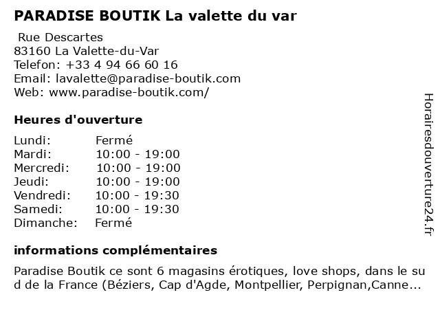 1 Paradise Boutik (SARL PLN) (Distance: 0,00 km) 3 Les Espaluns, 83160 La Valette-du-Var boutik, magasin de divertissements pour adultes, magasin d’accessoires de mode, magasin général, mode, paradise, pln, sarl 2 Disco Pub Dance Boy's Paradise (Distance: 6,07 km) 1 Boulevard Pierre Toesca, 83000 Toulon boy's, dance, disco, discothèque, gay, lesbienne, paradise, pub, restaurant 3 Paradise Coffee (Distance: 8,16 km) 12 Avenue du Lion, 83210 Sollies Pont coffee, paradise, repas, restaurants, snack 4 Hell And Paradise (Distance: 10,60 km) 7 Place Daniel Perrin, 83500 La Seyne-sur-Mer and, hell, paradise 5 Suzuki - AUTO SERVICE VAROIS - AS 83 - Magasin (Distance: 0,22 km) - Avenue de l'Université, 83160 La Valette-du-Var 83, as, auto, entretien, magasin, révisions, service, services d'automobiles, suzuki, varois, vidanges 6 Suzuki - AUTO SERVICE VAROIS - AS 83 - Service Après-Vente (Distance: 0,22 km) - Avenue de l'Université, 83160 La Valette-du-Var 83, après, as, auto, entretien, révisions, service, services d'automobiles, suzuki, varois, vente, vidanges |