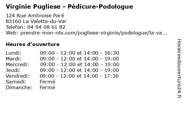 1 Virginie Pugliese - Pédicure-podologue (Distance: 0,00 km) 124 Rue Ambroise Paré, 83160 La Valette-du-Var consultation, docteur, med, médecin, podologue, pugliese, pédicure, traitement, virginie 2 Romain De Gea - Pédicure-podologue - secretariat (Distance: 5,45 km) 397 Chemin de l'Estagnol, 83260 La Crau de, gea, médecin, médecine, médical, pharmaceutique, podologue, pédicure, romain, secretariat, traitement 3 Virginie Rapale - Pédicure-podologue - secretariat (Distance: 5,78 km) 29 Boulevard Jules Michelet,, 83000 Toulon médecin, médecine, médical, pharmaceutique, podologue, pédicure, rapale, secretariat, traitement, virginie 4 Fabien Picard - Pédicure-podologue - secretariat (Distance: 6,64 km) 25 Rue Castel, 83000 Toulon fabien, médecin, médecine, médical, pharmaceutique, picard, podologue, pédicure, secretariat, traitement 5 Christine Lepreux - Pédicure-podologue - secretariat (Distance: 8,61 km) 46 Chemin Du Pont De Bois, 83200 Toulon christine, lepreux, médecin, médecine, médical, pharmaceutique, podologue, pédicure, secretariat, traitement 6 Alexandre Gely - Pédicure-podologue - secretariat (Distance: 9,87 km) 7B Avenue Gambetta, 83400 Hyères alexandre, gely, médecin, médecine, médical, pharmaceutique, podologue, pédicure, secfretariat, secretariat, traitement |