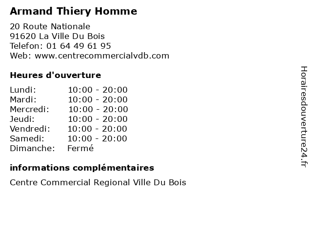 1 Armand Thiery Homme (Distance: 7,10 km) . Ville de Bois, 91620 La Ville du Bois armand, beaute, cafe, chaussures, enfants, homme, hommes, lingerie, mode femmes, restaurant, sport, thiery 2 Armand Thiery Homme (Distance: 7,21 km) 5 Zac de la Croix Blanche, 91700 Sainte-Genevieve des Bois accessoires, armand, habillement, homme, mode, pret à porter, thiery, vêtements 3 Armand Thiery Homme (Distance: 13,26 km) 2 Boulevard de l'Europe, 91000 Evry accessoires, armand, homme, mode, thiery, vêtements 4 Armand Thiery Femme (Distance: 0,00 km) 20 Route Nationale, 91620 La Ville Du Bois armand, cafe, chaussures, enfants, femme, homme, mode femme, restaurant, service, thiery 5 Terre d'Homme (Distance: 4,48 km) . Avenue de la Maison Neuve, 91227 Bretigny sur Orge beaute, boutiques, chaussures, d'homme, deco, enfants, mode femme, mode hommes, restaurant, sport, terre 6 Armand Thiery Femme (Distance: 7,10 km) . Ville de Bois, 91620 La Ville du Bois armand, beaute, cafe, chaussures, enfants, femme, hommes, lingerie, mode femmes, restaurant, sport, thiery |