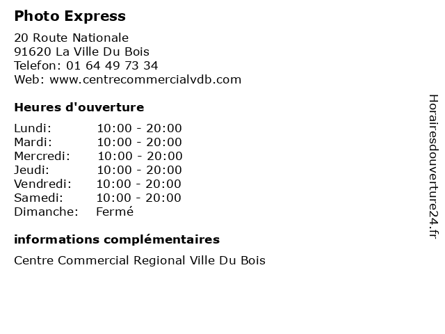 1 Photo Express (Distance: 7,10 km) . Ville de Bois, 91620 La Ville du Bois beaute, cafe, chaussures, enfants, express, hommes, lingerie, mode femmes, photo, restaurant, sport 2 Volkswagen - Galaxie Automobiles - Service Express (Distance: 1,04 km) 7 Rue des Prés, 91290 Arpajon atelier, automobile, automobiles, concessionnaire, express, galaxie, garage, neuve, occasion, réparation, service, vente, volkswagen 3 Allo Pizza Express (Distance: 4,00 km) 6 Boulevard de la République, 91220 Brétigny-sur-Orge allo, express, pizza, pizzeria, restaurant 4 France Express (Heures limites de dépôt) (Distance: 7,72 km) 6 Rue Mare à Blot, 91220 Le Plessis Pâté de, dépôt, express, france, heures, limites, poste, services, transporteur 5 France Express (Distance: 7,72 km) 6 Rue Mare à Blot, 91220 Le Plessis Pâté express, france, poste, services, transporteur 6  |