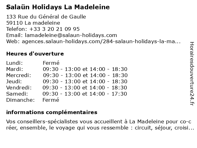 2 Salaün Holidays Lomme (Distance: 6,13 km) 775 Avenue de Dunkerque, 59160 Lille holidays, lomme, salaün 3 Salaün Holidays (Distance: 8,24 km) 18 avenue Jean-Baptiste Lebas, 59100 Roubaix agence, départ, holidays, location, salaün, séjour, voyage 4 Salaün Holidays Lens (Distance: 30,23 km) 22 Rue du Maréchal Leclerc, 62300 Lens holidays, lens, salaün 6 Salaün Holidays (Distance: 33,50 km) 21 Grand Place, 62400 Béthune agence, départ, holidays, location, salaün, séjour, voyage |