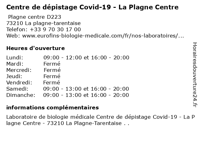 1 Centre de dépistage Covid-19 - La Plagne Centre (Distance: 0,01 km) Place Albert Perrière, 73210 La Plagne-Tarentaise 19, centre, covid, de, dépistage, la, plagne 2 Centre de dépistage Covid-19 - La Plagne Montchavin (Les Coches) (Distance: 7,53 km) 9 Rue Principale, 73210 La Plagne-Tarentaise 19, centre, coches, covid, de, dépistage, la, les, montchavin, plagne 3 Centre de dépistage Covid-19 - Les Arcs 1800 (Distance: 11,14 km) Terrasse Miraldi, 73700 Bourg-Saint-Maurice 19, 1800, arcs, centre, covid, de, dépistage, les 4 Centre de Vaccination COVID-19 - Centre Hospitalier Albertville Moutiers (Distance: 11,28 km) 43 Rue Ecole des Mines, 73600 Moutiers 19, albertville, centre, covid, covid 19, covid19, de, hospitalier, moutiers, médecin, médecine, médical, test, vaccin, vaccination, vaccins 5 Centre de dépistage Covid-19 - Les Arcs 1950 (Distance: 13,81 km) Pré Saint-Esprit, 73700 Bourg-Saint-Maurice 19, 1950, arcs, centre, covid, de, dépistage, les 6 Centre de Vaccination COVID-19 - Centre Hospitalier (Distance: 13,98 km) 139 Rue du Nantet, 73700 Bourg-Saint-Maurice 19, centre, covid, covid 19, covid19, de, hospitalier, médecin, médecine, médical, test, vaccin, vaccination, vaccins |