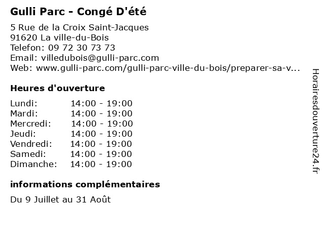1 Gulli Parc - Congé D'été (Distance: 12,85 km) 3 Rue de la Résistance, 94320 Thiais activité extérieur, attractions, congé, d'été, enfants, gulli, jeux, loisirs, parc, sorties 2 Gulli Parc - Congé Scolaire (hors été) (Distance: nan km) 5 Rue de la Croix Saint-Jacques, 91620 La ville-du-Bois activité extérieur, attractions, congé, enfants, gulli, hors, jeux, loisirs, parc, scolaire, sorties, été 3 Gulli Parc - Période Scolaire (Distance: nan km) 5 Rue de la Croix Saint-Jacques, 91620 La ville-du-Bois activité extérieur, attractions, enfants, gulli, jeux, loisirs, parc, période, scolaire, sorties 4 Refuge St Roch de Saulx les Chartreux ('été ) (Distance: 1,52 km) 97 Avenue Paul Doumer, 91160 Saulx les Chartreux 'été, animales, chartreux, de, les, refuge, refuges, roch, saulx, services, st 5 Mysterland - Congés Scolaire hors été (Distance: 2,01 km) 7 allée Saint Fiacres, 91310 Monthlery congés, enfants, hors, jeux, mysterland, parc de jeux couverts, scolaire, sorties, toboggan géants, été 6 Mysterland - Congés d'été (Distance: 2,01 km) 7 allée Saint Fiacres, 91310 Monthlery congés, d'été, enfants, jeux, mysterland, parc de jeux couverts, sorties, toboggan géants |