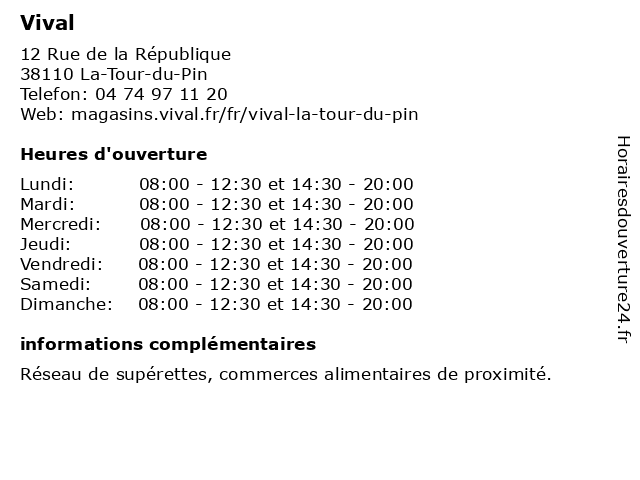 1 Vival (Distance: 2,80 km) 2 Avenue du Stade, 38110 Saint-Clair-de-la-Tour droguerie, d’hypermarchés, frais, fruits et légumes, hygiène, parfumerie et autres produits non alimentaires., surgelés, vival, épicerie 2 Vival (Distance: 4,46 km) 112 Route De Vaux, 38110 Saint-Victor-de-Cessieu supermarché, supérette, vival, épicerie 4 Vival (Distance: 12,88 km) 270 Rue des Auberges, 38300 Saint-Savin alimentation, distributeur alimentaire, supermarché, supérette, vival, épicerie 5 Vival (Distance: 13,30 km) 85 Route Nationale, 38300 Nivolas-Vermelle alimentaire, discount, distributeur, distribution, fruits, grande, hypermarché, légumes, supermarché, vival, épicerie 6 Vival (Distance: 13,49 km) 31 Bis Boulevard Saint-michel, 38300 Bourgoin Jallieu alimentation, distributeur alimentaire, superette, supermarché, vival, épicerie |