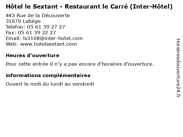 | Appeler Hôtel le Sextant - Restaurant le Carré (Inter-Hôtel) | |
