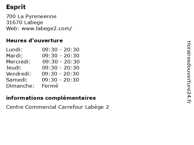 1 Esprit (Distance: 7,54 km) 57 route de la Pomme, 31000 Toulouse accessoires, chaussures, esprit, habillements, mode, vêtements 2 Esprit (Distance: 8,06 km) . Boulevard de l'Europe, 31127 Portet-sur-Garonne beaute, cafe, chaussures, deco, enfants, esprit, mode femmes, mode homme, restaurant, sport 3 Esprit (Distance: 17,43 km) 19 rue des Usines, 31150 Fenouillet accessoires, chaussures, esprit, habillements, mode, vêtements 4 Action SSI - L'Esprit Numérique (Distance: 0,92 km) 109 Rue Jean Bart, 31670 Labège action, action_ssi, entreprise, hébergement, informatique, ingénierie, l'esprit, multimédia, numérique, ssi 5 Esprit-RH (Distance: 7,10 km) 12 Boulevard Jules Michelet, 31000 Toulouse conseil, esprit, recrutement, rh, service, solution rh 6 Equilibre Corps Esprit (Distance: 8,24 km) 4 Rue d'Arcachon, 31200 Toulouse bien-etre, corps, equilibre, esprit, massages, relaxation, santé, thérapies |