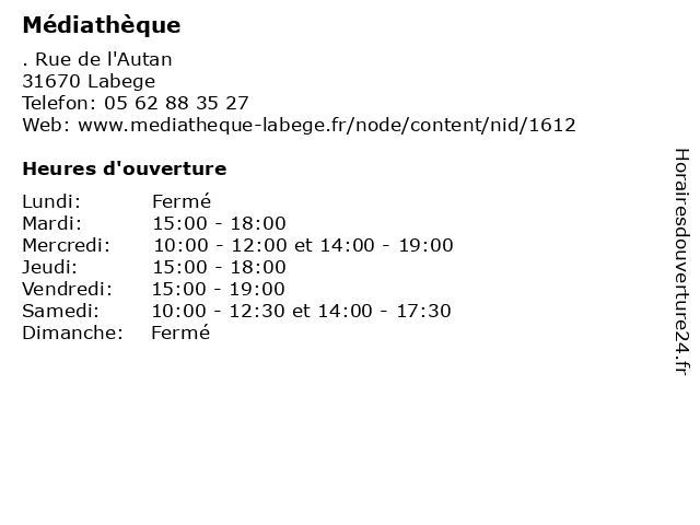 1 Médiathèque (Distance: 15,14 km) . Place Léo Lagrange, 31270 Cugnaux ateliers multimédia, expositions, médiathèque, rencontres littéraires. 2 Médiathèque (Distance: 16,18 km) . impasse Max Baylac, 31170 Tournefeuille cd audio, cd.rom, livres, médiathèque, revues 3 Médiathèque - Juillet & Août (Distance: 0,13 km) . Rue de l'Autan, 31670 Labege août, cd audio, cd.rom, juillet, livres, médiathèque, revues 4 Médiathèque municipale - Espace culturel Altigone (Distance: 2,65 km) . Place Jean Bellières, 31650 Saint-Orens de Gameville altigone, cd audio, cd.rom, culturel, espace, livres, municipale, médiathèque, revues 5 Médiathèque José Cabanis (Distance: 11,04 km) 1 Allée Jacques Chaban-Delmas, 31506 Toulouse bibliothèque, cabanis, josé, livre, médiathèque, services 6 Médiathèque de l'Ecole Supérieure d'Audiovisuel (Distance: 11,45 km) 56 rue du Taur, 31000 Toulouse catalogue en ligne, d'audiovisuel, de, l'ecole, médiathèque, supérieure, travaux audiovisuels |