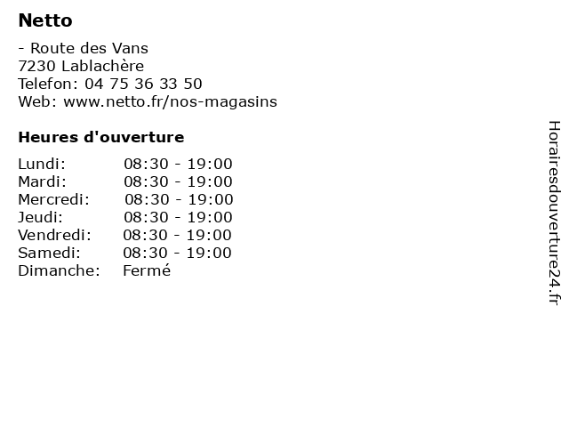1 Netto Station Service (Distance: 0,38 km) 453 Rue Charles Tourrel, 07230 Lablachère carburant, essences, gazole, netto, service, services, station 3 Netto (Distance: 21,83 km) 50 faubourg du Paradis, 30500 Saint-Ambroix achats de produits alimentaires, des prix bas, grands supermarchés, hard discount, netto, supermarchés 5 Netto Station Service (Distance: 32,18 km) - La Pomarède, 30110 Les Salles-du-Gardon carburant, essences, gazole, netto, service, services, station 6 Netto Station Service (Distance: 38,41 km) 3 bis Avenue Paul Langevin, 07400 Le Teil carburant, essences, gazole, netto, service, services, station |