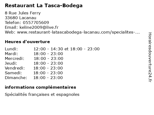 2 Bodega 502 - La Boutique (Distance: 41,19 km) 52 Avenue du Maréchal de Lattre de Tassigny, 33470 Gujan-Mestras 502, bar, bistro, bistrot, bodega, boutique, brasserie, café, la, pub, restaurant, restauration, resto, traiteur 4 Bodega El Pata Negra (Distance: 52,86 km) 16 Rue des Argentiers, 33000 Bordeaux bar, bodega, cuisine, el, espagnol, negra, pata, restaurant, restauration, tapas 5 La Bodega del Teatro (Distance: 53,07 km) 24 Rue de la Fagancerie, 33000 Bordeaux bar, bodega, del, el, jamon, la, restaurants, restauration, rincon, tapas, teatro 6 La Payotte (Distance: 0,11 km) 7 Boulevard de la Plage, 33680 Lacanau bar, boissons, cubain, la, payotte, restaurant, snack, tapas |