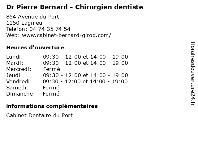 1 Bernard-Ciais Associes SARL (Distance: 1,12 km) 11 Espace d'Activité de Blossieu, 01150 Lagnieu associes, bernard, ciais, sarl 2 Dr Bernard Ballin - Médecin généraliste (Distance: 7,46 km) 151 Rue du Mail, 01150 Chazey-sur-Ain ballin, bernard, docteur, dr, generaliste, généraliste, medical, médecin, soin 3 Monsieur Alain Bernard (Distance: 8,44 km) 3 Rue Des Otages, 01230 St Rambert En Bugey alain, bernard, restaurants 4 Peyraud Bernard (Distance: 15,19 km) 7 Route De Lyon, 01800 St Maurice De Gourdans bailleurs, bernard, biens, immobiliers, nra, peyraud 5 Espace Vert Bernard (Distance: 15,85 km) 16 Avenue de l'Oiselon, 01160 Pont-d'Ain bernard, création, entretien, espace, jardins, vert, élagage 6 Dr Benjamin Girod - Chirurgien dentiste (Distance: 0,00 km) 864 Avenue du Port, 01150 Lagnieu benjamin, chirurgien, dentaire, dentiste, dr, girod, implantologie, parodontologie |