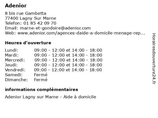 1 Adenior (Distance: 30,45 km) 86 rue des entrepreneurs, 75015 Paris accompagnement aux courses, adenior, aide aux repas, entretien du domicile, garde d'enfant, ménage, repassage 2 Adenior (Distance: 32,19 km) 48 avenue Victor Cresson, 92 Issy les Moulineaux adenior, domicile, ménage, repassage 3 Adenior (Distance: 34,90 km) 35 rue Louis Savoie, 95120 Ermont accompagnement, adenior, aide à domicile, medical, services 4 Adenior (Distance: 48,08 km) 6 Place de la Corne, 95300 Pontoise accompagnement, adenior, aide à domicile, medical, services 5 Ménage et repassage à domicile - Shiva Lagny sur Marne (Distance: 0,06 km) 33 Rue du Chemin de Fer, 77400 Lagny-sur-Marne domicile, et, lagny, marne, ménage, repassage, shiva, sur 6 MERCI+ (Distance: 0,16 km) 26 Rue d’Orgemont, 77400 Lagny-sur-Marne agence, domicile, merci+, ménage, services |