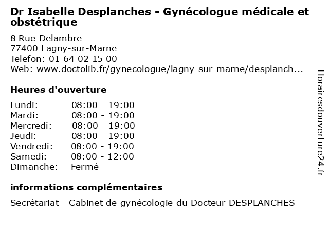 1 Laboratoire de Biologie Médicale - Lagny-sur-Marne - Cerballiance (Distance: 0,09 km) 46/48 Rue Du Chemin De Fer, 77400 Lagny-sur-Marne biologie, cerballiance, de, dépistages, laboratoire, lagny, marne, médicale, sur 2 Cabinet d'Ophtalmologie Médicale et Chirurgicale - Médecine générale (Distance: 1,03 km) 39 Rue du Pont Hardy, 77400 Lagny sur Marne cabinet, chirurgicale, consultation, d'ophtalmologie, docteur, et, générale, médecine, médicale, santé 3 Dr Isabelle Masse-Lafargouette - Médecin généraliste (Distance: 1,39 km) 17 Avenue Albert Camus, 77400 Lagny-sur-Marne docteur, dr, generaliste, généraliste, isabelle, lafargouette, masse, medical, médecin, soin 4 Dr Rabab Mosbah - Gynécologue obstétricienne (Distance: 4,82 km) 9 Boulevard Pierre Mendès France, 77600 Bussy-Saint-Georges bebe, dr, gynecologie, gynécologue, maternite, mosbah, obstetrique, obstétricienne, rabab 5 Dr Philippe Lalau - Gynécologue médical et obstétrique (Distance: 5,51 km) 42c Avenue de Lingenfeld, 77200 Torcy bebe, dr, et, gynecologie, gynécologue, lalau, maternite, médical, obstetrique, obstétrique, philippe 6 Dr Danièle Partouche - Gynécologue obstétricien (Distance: 5,62 km) - Rue Marie Curie, 77177 Brou-sur-Chantereine consultation, danièle, docteur, dr, gynécologue, med, médecin, médecine, obstétricien, partouche, secrétariat, traitement |