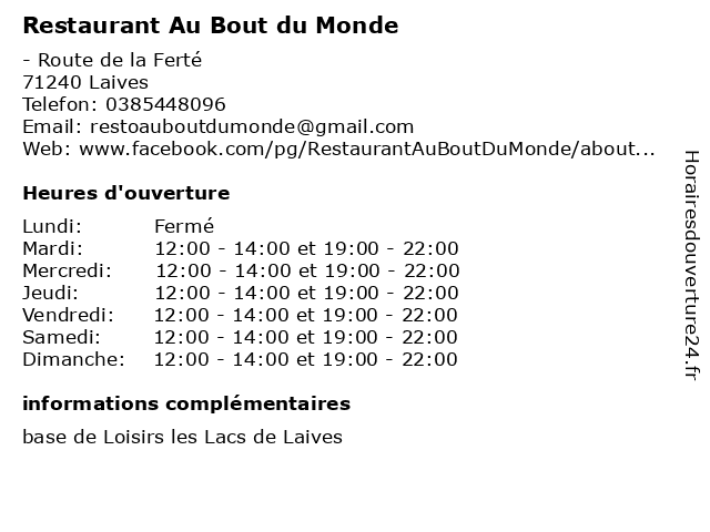 | Dimanche | 12:00-14:00 et 19:00-22:00 |