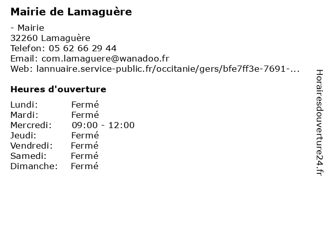 1 Mairie de Lamaguère (Distance: 6,75 km) . Mairie, 32260 Lamaguère administration, assoc public, de, lamaguère, mairie 2 Mairie de Gaujac (Distance: 12,83 km) - Le Village, 32220 Gaujac commune, de, démarche, formalités, gaujac, information, mairie 3 Mairie de Montamat (Distance: 13,83 km) - Le Village, 32220 Montamat commune, de, démarche, formalités, information, mairie, montamat 4 Mairie de Lahas (Distance: 18,97 km) - Village, 32130 Lahas commune, de, démarche, formalités, information, lahas, mairie 5 Mairie de Lombez (Distance: 19,37 km) - place de l'Hôtel de Ville, 32220 Lombez commune, de, démarche, formalités, information, lombez, mairie 6 Mairie de Samatan (Distance: 20,80 km) 2 place de la Fontaine, 32130 Samatan commune, de, démarche, formalités, information, mairie, samatan |