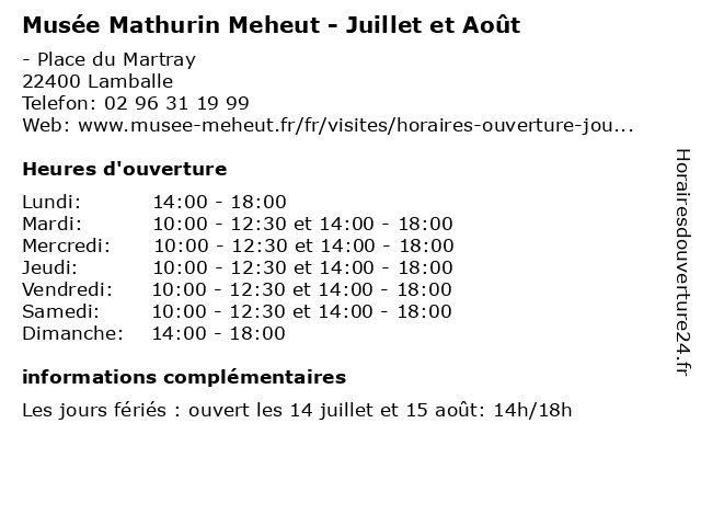 | Mercredi | 10:00-12:30 et 14:00-18:00 |