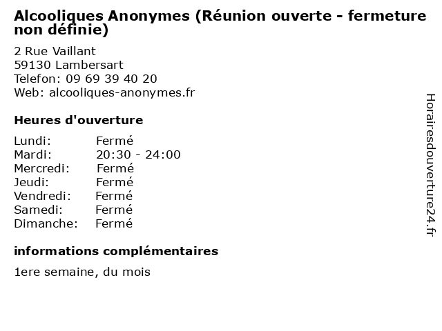 Termes de recherche pour Alcooliques Anonymes (Réunion ouverte - fermeture non définie):reunion, non, fermeture, ouverte, alcooliques, anonymes, définie, fermée  |