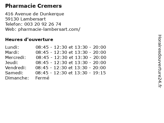 | Lundi | 08:45-12:30 et 13:30-20:00 |