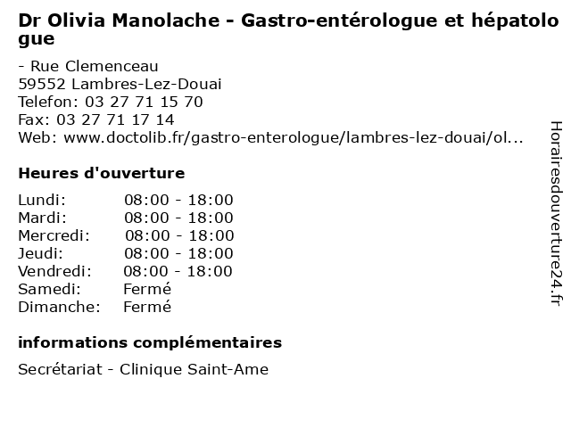 1 Dr Loic Guerbau - Gastro-entérologue et hépatologue (Distance: 0,00 km) - Rue Clemenceau, 59552 Lambres-Lez-Douai docteur, dr, entérologue, et, gastro, generaliste, guerbau, hépatologue, loic, medecin, sante 2 Dr Dominique Vanco - Gastro-entérologue et hépatologue (Distance: 0,00 km) - Rue Clemenceau, 59552 Lambres-Lez-Douai dominique, dr, enterelogue, entérologue, et, gastro, hepatolgue, hépatologue, soins, vanco 3 Medecin Sebastien Ratajczyk (hépatologue) (Distance: 0,35 km) . Clemenceau, 59552 Lambres lez Douai docteur, hépatologue, medecin, ratajczyk, sante, sebastien, services 4 Dr Houssem Ben Ali - Gastro-entérologue et hépatologue (Distance: 1,53 km) - Route de Cambrai, 59507 Douai ali, ben, consultation, docteur, dr, entérologue, et, gastro, houssem, hépatologue, med, médecin, médecine, traitement 5 Medecin Arnaud Dewailly (hépatologue) (Distance: 10,27 km) 235 Avenue Paul-Vaillant-Couturier, 62110 Henin Beaumont arnaud, dewailly, docteur, hépatologue, medecin, sante, services 6 Medecin Claude Valmage (hépatologue) (Distance: 10,27 km) 235 Avenue Paul Vaillant Couturier, 62110 Henin Beaumont claude, docteur, hépatologue, medecin, sante, services, valmage |