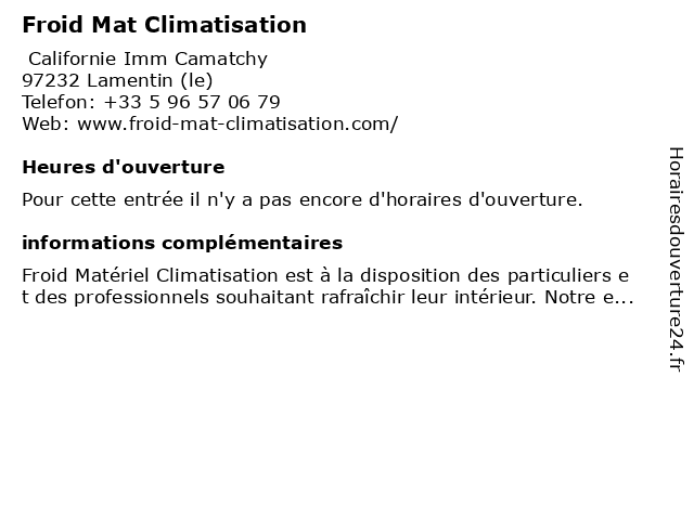 1 Point Mat (Distance: 1,07 km) . Lotissement les Hauts de Californie, 97232 Le Lamentin charpente, isolation, mat, matériaux, menuiserie, outillage, point, toit 2 Froid Clim Assistance Caraïbes (Distance: 1,35 km) Chemin Basse Gondeau, 97232 Le Lamentin assistance, caraïbes, clim, froid 3 Leader Mat (Distance: 2,69 km) . Zone de Manhity, 97232 Le Lamentin carrelage, leader, mat, matériaux, menuiserie, outillage, sanitaires 4 Delta Froid Energie (Distance: 4,69 km) 75 Route de Saint Joseph, 97212 Saint-Joseph delta, energie, froid 5 Point Mat - Starmat (Distance: 5,91 km) . ZI Champigny, 97224 Ducos charpente, isolation, mat, matériaux, menuiserie, outillage, point, starmat, toit 6 |