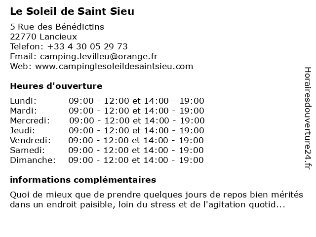 | Dimanche | 09:00-12:00 et 14:00-19:00 |