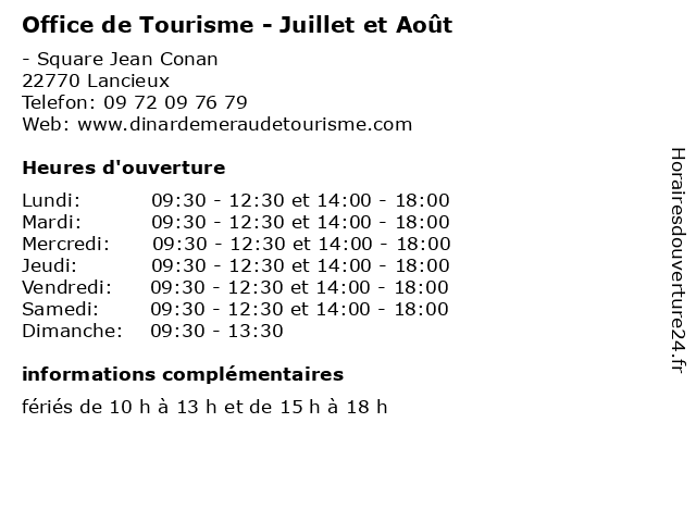 Termes de recherche pour Office de Tourisme - Juillet et Août:et, de, point, transports, restaurants, office, tourisme, août, information, juillet, lancieux, horaires des musées |
