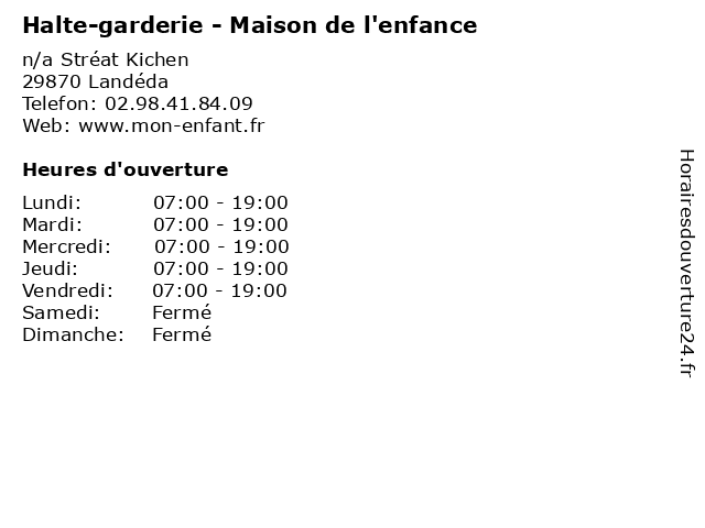 1 Halte-garderie (Distance: 13,48 km) 7 Rue de l'école, 29290 Lanrivoare caregivers houses, child care, family home, garderie, halte, home care, kindergartens, micro-nurseries, parental home 2 Maison de l'enfance (Distance: 13,99 km) 25 Rue de l'Aber, 29860 Plabennec caregivers houses, child care, de, family home, home care, kindergartens, l'enfance, maison, micro-nurseries, parental home 3 Service Enfance Jeunesse Éducation (Distance: 17,36 km) 12 Place Léon Cheminant, 29290 Saint-Renan activités, enfance, espace, jeunes, jeunesse, loisirs, service, Éducation 4 Halte-Garderie (Distance: 17,99 km) 4 Rue Alexandre Lemonnier, 29820 Guilers caregivers houses, child care, family home, garderie, halte, home care, kindergartens, micro-nurseries, parental home 5 Halte-Garderie (Distance: 18,24 km) 5 Rue Jeanne d'arc, 29260 Lesneven caregivers houses, child care, family home, garderie, halte, home care, kindergartens, micro-nurseries, parental home 6 Halte-garderie de Ty-An-Holl (Distance: 20,31 km) 4 Rue Messager, 29200 Brest an, caregivers houses, child care, de, family home, garderie, halte, holl, home care, kindergartens, micro-nurseries, parental home, ty |