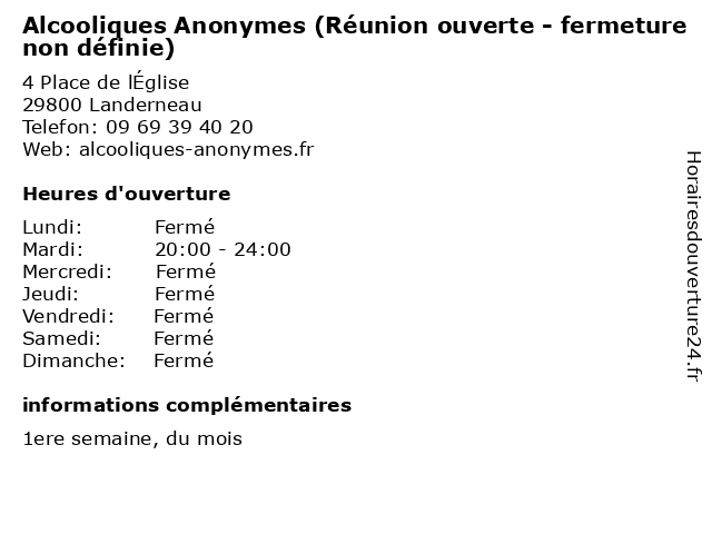 1 Alcooliques Anonymes (Réunion ouverte - fermeture non définie) (Distance: 10,81 km) - Place Jeanne d'Arc, 29400 Landivisiau alcooliques, anonymes, définie, fermeture, non, ouverte, réunion 2 Alcooliques Anonymes (Réunion fermée - fermeture non définie) (Distance: 0,00 km) 4 Place de lÉglise, 29800 Landerneau alcooliques, anonymes, définie, fermeture, fermée, non, réunion 3 Alcooliques Anonymes (Réunion fermée - fermeture non définie) (Distance: 10,81 km) - Place Jeanne d'Arc, 29400 Landivisiau alcooliques, anonymes, définie, fermeture, fermée, non, réunion 4 Alcooliques Anonymes (Réunion ouverte - fermeture non définie) (Distance: 20,78 km) 6 Rue Pen Ar Créac'h, 29200 Brest alcooliques, anonymes, définie, fermeture, non, ouverte, réunion 5 Alcooliques Anonymes (Réunion fermée - fermeture non définie) (Distance: 20,78 km) 6 Rue Pen Ar Créac'h, 29200 Brest alcooliques, anonymes, définie, fermeture, fermée, non, réunion 6 Alcooliques Anonymes (Réunion fermée - fermeture non définie) (Distance: 23,17 km) 22 Rue Louis Pasteur, 29200 Brest alcooliques, anonymes, définie, fermeture, fermée, non, réunion |