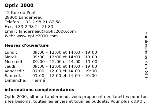 1 Optic 2000 (Distance: 0,10 km) 15 Rue du Pont, 29800 Landerneau 2000, care, clinic, doctor, health, optic, optique, vision 3 Optic 2000 (Distance: 14,33 km) 91 Route de Lanarvily, 29260 Le Folgoët 2000, lunettes, optic, santé, solaires 6 |
