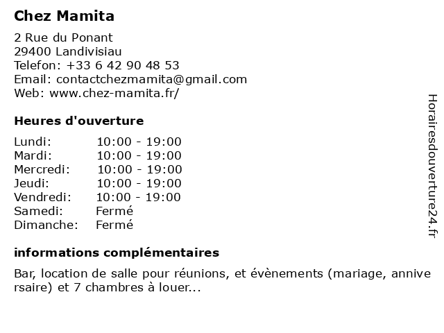 2 Chez Adamo (Distance: 15,17 km) 9 Rue du Pont, 29800 Landerneau adamo, chez, chicken, dominique, frites, restaurants, six 3 Chez Tom (Distance: 19,40 km) 18 rue Notre Dame, 29260 Lesneven bar, café, chez, français, restauration, tom 4 Hotel du Centre Chez Janie (Distance: 23,67 km) . Rue Gambetta, 29681 Roscoff bar, centre, chez, du, hotel, janie, restaurant, service 5 Chez Zaza (Distance: 33,27 km) 5 rue Coat Ar Gueven, 29200 Brest chez, français, restaurant, traditionnel, zaza 6 Resto Bistro Chez Coco (Distance: 33,94 km) 38 Rue Quai de la Douane, 29200 Brest affaires, bistro, chez, coco, resto, service |