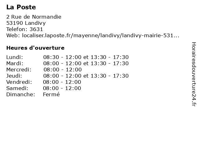 1 La Poste (Distance: 4,48 km) - Le Bourg, 50640 Savigny-le-Vieux express chronopost, la, poste, réexpédition internationale 3 La Poste (Distance: 5,12 km) 5 Rue Sainte Anne, 53220 Pontmain colis, express chronopost, expédition, la, poste, réexpédition internationale, service, suivi du courrier 5 La Poste (Distance: 9,04 km) 1 Place de la Mairie, 53220 Saint-Ellier-du-Maine agence, assurance, banque, banque postale, bureau de poste, chronopost, colis, courrier, dps, expéditions internationales, la, point, postale, poste, relais, timbres, téléphonie, ups, western union 6 La Poste (Distance: 10,34 km) - Le Bourg, 50600 Grandparigny agence postale, courrier postal, expédition internationale, la, poste |