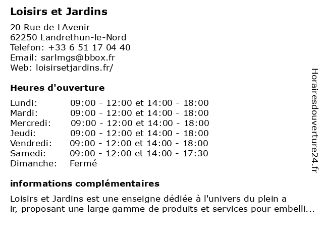 1 Loisirs et jardin (Distance: 0,03 km) 20 Rue de l'Avenir, 62250 Landrethun-le-Nord espaces verts, et, jardin, loisirs, micro-tracteurs, motoculture, tondeuses 2 Daniel Moquet signe vos jardins - Ent. Latour (Distance: 11,65 km) 1251 Rue du Bosquet Fanette, 62142 Bellebrune création, daniel, débroussaillage, engazonnement, ent., entretien, espace vert, jardin, jardins, latour, moquet, signe, taille, taille de haies, tonte de pelouse, vos 3 Verts Loisirs (Distance: 12,13 km) 7 rue Louis Denis, 62137 Coquelles biner et fraiser traiter, faire des plantations, irriguer, jardinage, labourer, loisirs, société: aspirer et souffler, transporter, verts 4 France Loisirs (Distance: 12,97 km) 85 Boulevard la Fayette, 62100 Calais club de lecture, france, livres, loisirs, offres d'édition, romans 5 Clabaut Moto Loisirs (Distance: 15,45 km) 15 Rue du Mont Joie, 62280 Saint-Martin-Boulogne clabaut, concessionnaire, entretien, loisirs, moto, reparation, vente 6 Les Jardins D'Arcadie (Distance: 16,20 km) 18 Bois du Mont Lambert, 62280 Saint-Martin-Boulogne d'arcadie, jardins, les |