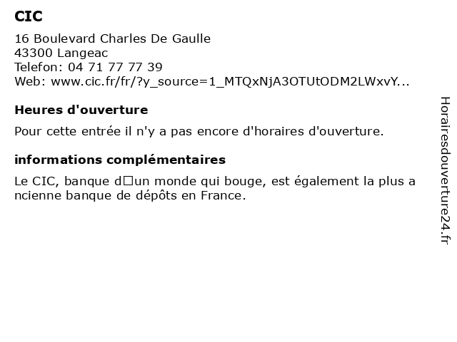 1 Crédit Industriel et Commercial (CIC) (Distance: 0,01 km) 16 Boulevard Charles de Gaulle, 43300 Langeac agence, assurance, bancaire, banque, cic, commercial, crédit, et, industriel 2 Crédit Industriel et Commercial (CIC) (Distance: 23,03 km) 2 Boulevard Dr Devins, 43100 Brioude agence, assurance, bancaire, banque, cic, commercial, crédit, et, industriel 3 CIC (Distance: 31,19 km) 21 Place Du Breuil, 43000 Le Puy En Velay cic, compagnie de téléphone, organisme d'assurance 4 CIC (Distance: 37,70 km) 25 Faubourg Constant, 43500 Craponne Sur Arzon cic, compagnie de téléphone, organisme d'assurance 5 CIC (Distance: 49,55 km) 1 Place Charles De Gaulle, 43200 Yssingeaux cic, compagnie de téléphone, organisme d'assurance 6 CIC (Distance: 53,20 km) 3 Rue De La Place D Espagne, 63500 Issoire cic, compagnie de téléphone, organisme d'assurance |