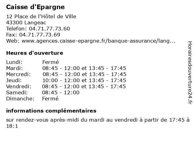 1 Caisse Primaire D'Assurance Maladie (Distance: 0,14 km) . Rue Dumas, 43300 Langeac administration, assoc, caisse, d'assurance, maladie, primaire, services, services publics 2 Caisse Primaire D'Assurance Maladie (Accueil téléphonique) (Distance: 0,14 km) . Rue Dumas, 43300 Langeac accueil, administration, assoc, caisse, d'assurance, maladie, primaire, services, services publics, téléphonique 3 Caisse d'Épargne (Distance: 15,98 km) 8 Place Joseph Limozin, 43170 Saugues banque, caisse, carte, d'epargne, d'épargne, services 4 Banque Populaire Auvergne Rhône-Alpes (Distance: 0,08 km) 25 boulevard Charles de Gaulle, 43300 Langeac alpes, assurances, auvergne, banque, populaire, rhône 6 GAN ASSURANCES LANGEAC VILLE (Distance: 0,09 km) 29 Rue Marengo, 43300 Langeac assurances, gan, langeac, ville |