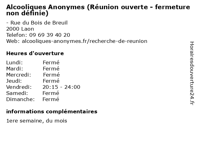 Termes de recherche pour Alcooliques Anonymes (Réunion ouverte - fermeture non définie):reunion, non, fermeture, ouverte, alcooliques, anonymes, définie, fermée |