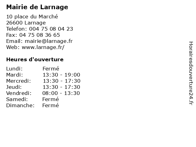 1 Mairie de Larnage (Distance: 0,00 km) 10 place du Marché, 26600 Larnage administration, assoc public, de, larnage, mairie, service 2 Mairie de Larnage (Distance: 4,23 km) 10 Marché, 26600 Larnage administration, assoc public, de, larnage, mairie 3 Mairie de La Motte de Galaure (Distance: 11,66 km) 1 Place Latour Maubourg, 26240 La Motte de Galaure administration, commune, de, galaure, la, maire, mairie, motte, public, service 4 Mairie d'Alixan (Distance: 17,32 km) 1 place de l'Esplanade, 26300 Alixan administration, commune, d'alixan, maire, mairie, public, service 5 Mairie de Leoncel (Distance: 33,20 km) 75 chemin de l'Abbaye, 26190 Leoncel administration, commune, de, leoncel, maire, mairie, public, service 6 Mairie de Graix (Distance: 36,11 km) - Place de la Mairie, 42220 Graix administration, administratives, de, démarches, graix, maire, mairie, public, service |