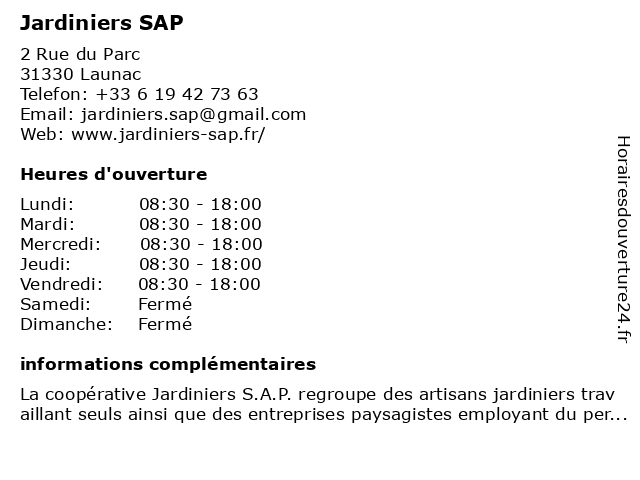 3 Jardiniers SAP Mondonville (Distance: 11,12 km) 5 Allée des Pins, 31700 Mondonville jardiniers, mondonville, sap 4 Jardiniers SAP L Isle Jourdain (Distance: 16,15 km) 6 Rue Henri Bordes, 32600 L'Isle-Jourdain isle, jardiniers, jourdain, sap 6 Jardiniers SAP Castelsarrasin (Distance: 32,50 km) 31 Avenue du Maréchal Koenig, 82100 Castelsarrasin castelsarrasin, jardiniers, sap  |