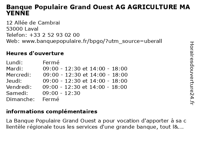 1 Banque Populaire Grand Ouest AG PROFESSIONNELS LAVAL (Distance: 0,00 km) 12 Allée de Cambrai, 53000 Laval ag, banque, grand, laval, ouest, populaire, professionnels 2 Banque Populaire Grand Ouest Agriculture Mayenne (Distance: 0,01 km) 12 Allée de Cambrai, 53000 Laval agriculture, banque, grand, mayenne, ouest, populaire 3 Banque Populaire Grand Ouest AGENCE ENTREPRISES MAYENNE (Distance: 0,02 km) 12 Allée de Cambrai, 53000 Laval agence, banque, entreprises, grand, mayenne, ouest, populaire 4 CASDEN Banque Populaire (Distance: 0,08 km) 7 allée du Vieux Saint Louis, 53000 Laval argents, banque, casden, conseils, offres, populaire, épargne 5 Centre Social Lavallois d'Education Populaire (CLEP) (Distance: 0,16 km) 8 Impasse Haute Chiffolière, 53000 Laval centre, clep, d'education, famille, lavallois, populaire, santé, social, travail 6 Banque Populaire Grand Ouest Laval Gare (Distance: 0,77 km) 70 Avenue Robert Buron, 53000 Laval banque, gare, grand, laval, ouest, populaire |