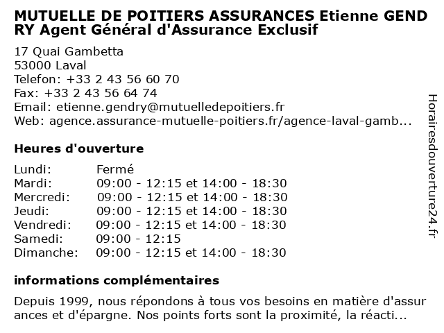 1 Mutuelle de Poitiers Assurances - Etienne GENDRY (Distance: 0,00 km) 17 Quai Gambetta, 53000 Laval assurance auto, assurance auto laval, assurance habitation, assurance habitation laval, assurance professionnelle, assurance professionnelle laval, assurance scolaire, assurance scolaire laval, assurance vie, assurance vie laval, assurances, complémentaire santé, complémentaire santé laval, de, etienne, gendry, mutuelle, mutuelle de poitiers, mutuelle de poitiers assurances, mutuelle de poitiers assurances laval, mutuelle de poitiers laval, mutuelle laval, poitiers, prévoyance, prévoyance laval 2 AXA Assurance et Banque Beucher Desmares (Distance: 0,17 km) 25 Rue Jules Ferry, 53000 Laval assurance, assurance appartement, assurance auto, assurance entreprise, assurance epargne, assurance habitation, assurance maison, assurance professionnelle, assurance santé, assurance voiture, axa, banque, beucher, desmares, et 3 GMF Assurance (Distance: 0,20 km) 7 Quai Sadi Carnot, 53000 Laval agence, agent, assurance, auto, gmf, habitation, prévoyance, santé 4 MUTUELLE DE POITIERS Clement Perigois Agent Général d'Assurance Exclusif (Distance: 0,30 km) 46 Rue du Général de Gaulle, 53000 Laval agent, clement, d'assurance, de, exclusif, général, mutuelle, perigois, poitiers 5 Mutuelle de Poitiers Assurances - Clément PERIGOIS (Distance: 0,30 km) 46 Rue du Général de Gaulle, 53000 Laval assurance auto, assurance auto laval, assurance habitation, assurance habitation laval, assurance professionnelle, assurance professionnelle laval, assurance scolaire, assurance scolaire laval, assurance vie, assurance vie laval, assurances, clément, complémentaire santé, complémentaire santé laval, de, mutuelle, mutuelle de poitiers, mutuelle de poitiers assurances, mutuelle de poitiers assurances laval, mutuelle de poitiers laval, mutuelle laval, perigois, poitiers, prévoyance, prévoyance laval 6 Axa Assurance (Distance: 0,43 km) 5 Grande Rue, 53002 Laval assurance, assurance prêt, assurances, axa, services |