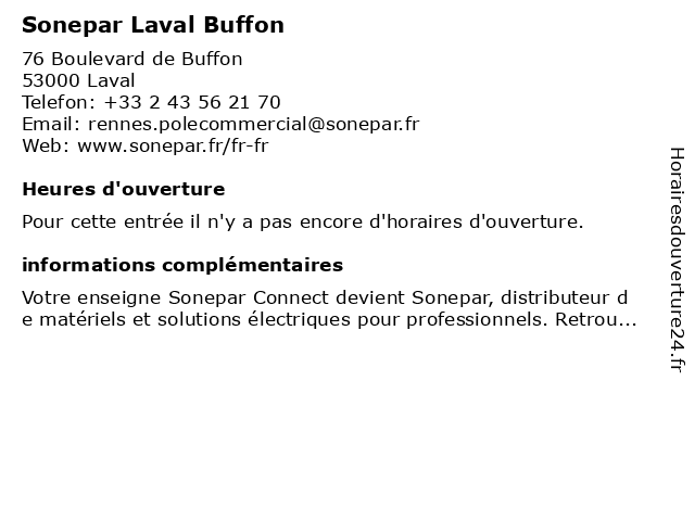 1 Sonolec - Groupe Sonepar (Distance: 0,01 km) 76 Boulevard de Buffon, 53000 Laval bâtiment, connect, construction, groupe, installations, services, sonepar, sonolec, électricité 4 Sonepar Plateforme Châteaubourg (Distance: 50,52 km) Rue de la Gaultière, 35220 Châteaubourg châteaubourg, plateforme, sonepar |