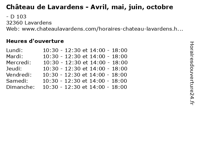 | Dimanche | 10:30-12:30 et 14:00-18:00 |