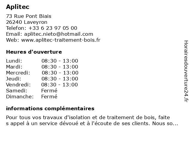 1 Aplitec (Distance: 0,00 km)73 Rue du Pont Biais, 26240 Laveyron aplitec