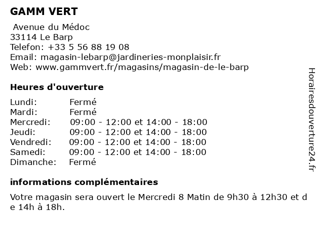 | Mercredi | 09:00-12:00 et 14:00-18:00 |