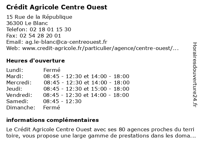 1 Crédit Agricole Centre Ouest (Distance: 11,41 km) 10 Avenue Jean Jaurès, 36370 Bélâbre agricole, centre, crédit, ouest 2 Crédit Agricole Centre Ouest (Distance: 14,35 km) 38 Rue de la Mairie, 36220 Tournon-Saint-Martin agricole, centre, crédit, ouest 3 Centre Ouest Ambulances Val de l'Indre (Distance: 0,94 km) 3 Rue de la Trimouille, 36300 Le Blanc ambulances, centre, de, l'indre, ouest, val 4 CREDIT AGRICOLE SAINT-SAVIN (Distance: 17,08 km) 14 Place de la Libération, 86310 Saint-Savin agricole, credit, saint, savin 5 Crédit Agricole (Distance: 17,13 km) - Place de la Libération, 86310 Saint-Savin agence, agricole, assurance, bancaire, banque, crédit 6 Crédit Agricole - Espace Libre-Service (Distance: 17,13 km) - Place de la Libération, 86310 Saint-Savin agence, agricole, assurance, bancaire, banque, crédit, espace, libre, service |