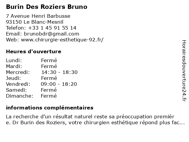 1 Burin des Roziers Bruno (Distance: 19,48 km) 240 Boulevard Jean Jaurès, 92100 Boulogne-Billancourt bruno, burin, des, roziers 2 Dr Bruno Chevallier - Gynécologue médical et obstétrique (Distance: 0,01 km) 7 Avenue Henri Barbusse, 93150 Le Blanc-Mesnil bruno, chevallier, dr, et, gynécologie, gynécologue, médical, obstétrique 3 Dr Bruno Burin des Roziers - Chirurgien plasticien et esthétique (Distance: 0,07 km) 10 Rue Roger Salomon, 93700 Drancy bruno, burin, chirurgien, consultation, des, docteur, dr, esthétique, et, med, médecin, médecine, plasticien, roziers, traitement 4 Teixera Bruno Ervoes Texeira m (Distance: 1,69 km) 164 Avenue Henri Barbusse, 93700 Drancy bruno, ervoes, restaurants, teixera, texeira 5 Teixera Bruno Duarte (Distance: 1,69 km) 164 Avenue Henri Barbusse, 93700 Drancy bruno, duarte, restaurants, teixera 6 Bruno Doe-Bruce - Ostéopathe (Distance: 2,80 km) 12 Rue Fernand Herbaut, 93600 Aulnay-sous-Bois bruce, bruno, care, clinic, dentist, doe, france, gynécologue, health, kinesitherapeute, ophtalmologiste, orl, ostéopathe, psychologue, service |