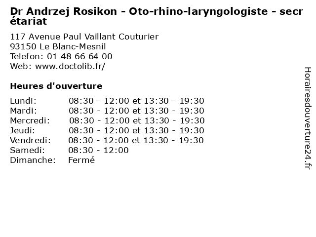 1 Dr Andrzej Rosikon - ORL (Distance: 1,18 km) 66 Avenue de la République, 93150 Le Blanc-Mesnil andrzej, cou., de, des, dr, du, gorge, l'oreille, la, nez, orl, rosikon, traitement, troubles, tête 2 Dr Jack Benzaken - Oto-rhino-laryngologiste (Distance: 3,98 km) 135 Avenue Vauban, 93190 Livry-Gargan benzaken, consultation, docteur, dr, jack, laryngologiste, med, médecin, médecine, oto, rhino, secrétariat, traitement 3 Dr Aleksandrov - Oto-rhino-laryngologiste - secrétariat (Distance: 5,55 km) 36 Rue Saint-Claude, 93190 Livry-Gargan aleksandrov, consultation, docteur, dr, laryngologiste, med, médecin, médecine, oto, rhino, secrétariat, traitement 4 Dr Catherine Mendiburu - Oto-rhino-laryngologiste - secrétariat (Distance: 5,55 km) 36 Rue Saint-Claude, 93190 Livry-Gargan catherine, consultation, docteur, dr, laryngologiste, med, mendiburu, médecin, médecine, oto, rhino, secrétariat, traitement 5 Dr Andrzej Rosikon - Médecin ORL (Distance: 6,20 km) - Boulevard Robert Ballanger, 93600 Aulnay-sous-Bois andrzej, ballanger, centre, dr, hospitalier, intercommunal, laryngologie, médecin, orl, oto, rhino, robert, rosikon 6 Centre Hospitalier Saint-Denis - Oto-rhino-laryngologie (Distance: 7,15 km) 2 Rue du Dr Delafontaine, 93200 Saint-Denis bureau, centre, consultation, denis, dr, hospitalier, laryngologie, maladie, med, médecin, médecine, oto, pratique, rhino, saint, thérapie, traitement |