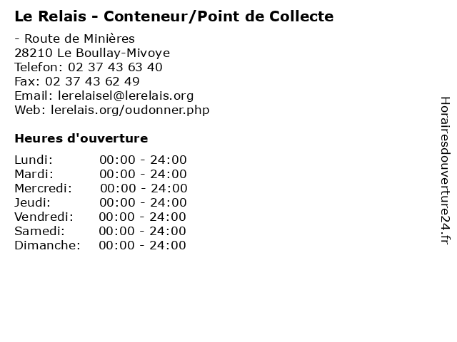 1 Le Relais - Conteneur/Point de Collecte (Distance: 2,08 km) 2 Rue la Mairie, 28210 Le Boullay-Mivoye collecte, conteneur/point, de, dons, le, point, relais, vêtements 2 Le Relais - Conteneur/Point de Collecte (Distance: 4,12 km) - Rue des Acacias, 28170 Serazereux collecte, conteneur/point, de, dons, le, point, relais, vêtements 3 Le Relais - Conteneur/Point de Collecte (Distance: 4,52 km) - Rue de la Libération, 28210 Villemeux-sur-Eure collecte, conteneur/point, de, dons, le, point, relais, vêtements 4 Le Relais - Conteneur/Point de Collecte (Distance: 4,86 km) 1 Rue de Tréon, 28210 Villemeux-sur-Eure collecte, conteneur/point, de, dons, le, point, relais, vêtements 5 Le Relais - Conteneur/Point de Collecte (Distance: 5,31 km) - Rue des Chenevières, 28500 Marville-Moutiers-Brûle collecte, conteneur/point, de, dons, le, point, relais, vêtements 6 Le Relais - Conteneur/Point de Collecte (Distance: 6,84 km) n/a Route d'Ormoy, 28210 Nogent-le-Roi collecte, conteneur/point, de, dons, le, point, relais, vêtements |